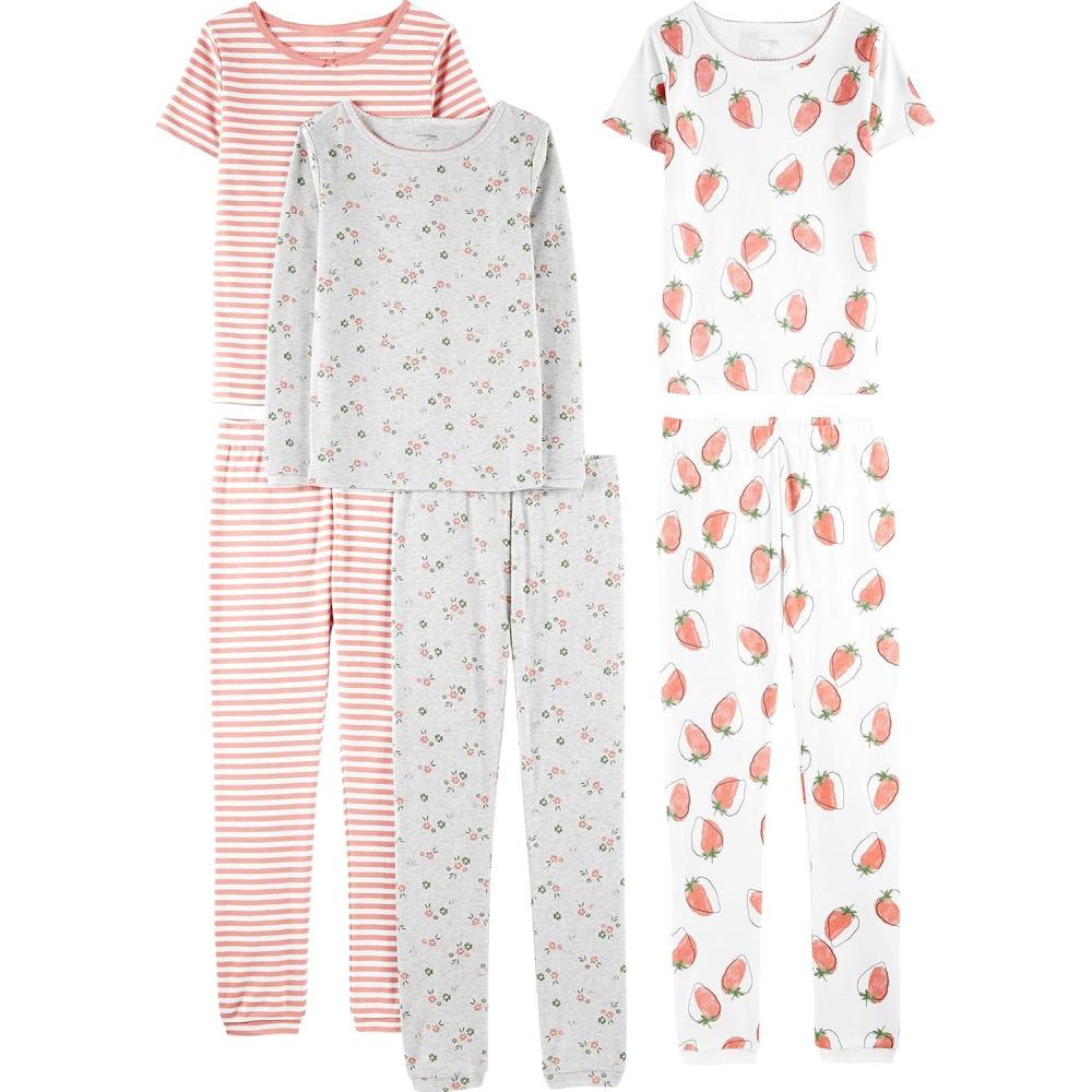 Simple Joys by Carter’s Babies, Toddlers, and Girls’ 6-Piece Snug-Fit Cotton Pajama Set, Pack of 3(Grey Floral/Pink Stripe/White Strawberry)