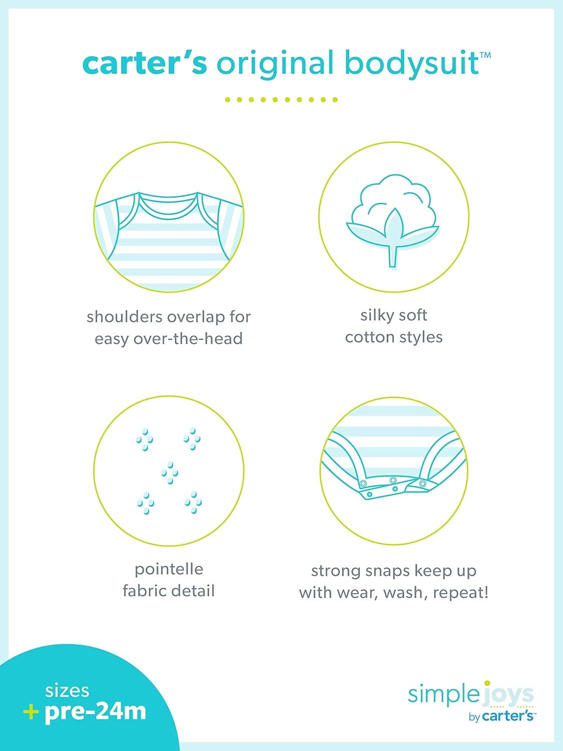 Simplify dressing your baby boy with this 6-pack of short-sleeve bodysuits from Simple Joys by Carter's. Each bodysuit features expandable shoulders that make it easy to slip over your baby’s head, while the strong, nickel-free snaps ensure quick and hassle-free diaper changes. Made from 100% soft and breathable cotton, these bodysuits are gentle on your baby's skin and perfect for everyday wear. The tagless design eliminates irritation, keeping your baby comfortable all day long. With OEKO-TEX Standard 100 certification, you can trust that these bodysuits are safe and free from harmful substances. Available in a convenient 6-pack, these bodysuits provide exceptional value and are designed to mix and match easily with any outfit. Simple Joys by Carter's delivers high-quality, stylish clothing at affordable prices, making this 6-pack a smart choice for parents looking for both quality and value.
