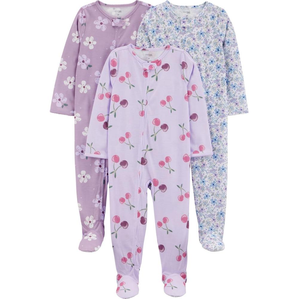 A three-pack of colorful long-sleeve footed pajamas featuring playful prints and ankle-to-chin zippers for easy changes.